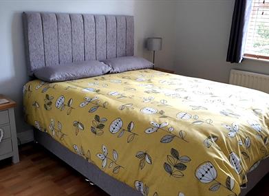 Second Bedroom: Double bed, dressing table and hairdryer. Views over the rear garden.