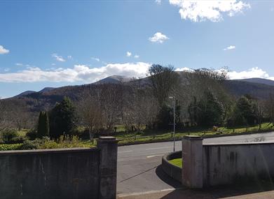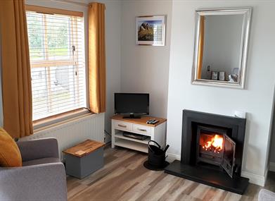 First floor Living Room: With stunning views over Tollymore Forest, the Mourne Mountains and to the sea beyond the large living room has a comfortable sofa and armchairs along with a multi-fuel stove, TV, DVD player, Hi-Fi and an extensive collection of books, CDs, DVDs and games for our guests to enjoy. There is also a Juliet balcony to make the most of the views.