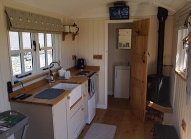 The shepherds hut is a bespoke build to fit into the orchard at Nutgrove. It has all the comforts of home, fitted kitchen, ensuite bathroom, double bed, log stove, electric heating and free sat television.Outside we have table and chairs so you have the pleasure of stepping out in the morning with a cup of freshly brewed tea or coffee into the glorious surroundings of the orchard and gardens with views of the Mourne Mountains.