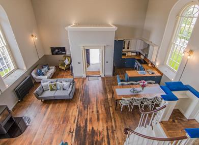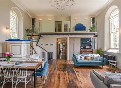 The centrepiece of the church is the massive open plan double height space comprising of zones for kitchen, dining and lounge seating around a large wood stove. Light streams in from the huge windows. It is the perfect social space.