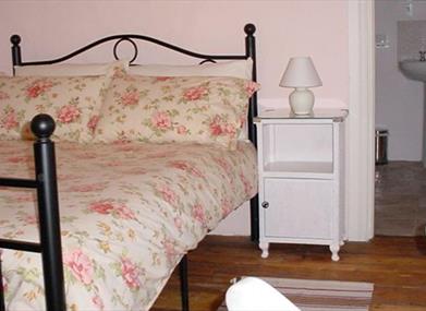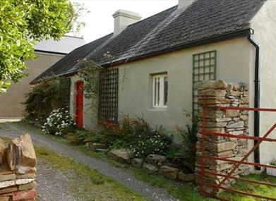The original seventeenth century house on our hill farm, Rose cottage has been tastefully restored to retain its character and traditional cottage features- a crook and crane over the open fire, exposed stonework, quarry tiled floors and half-doors. Happily for our guests, we added the comforts of oil central heating, hot water and electrical appliances.The roses and honeysuckle around the red painted doors only hint at the cottage's delightful interior. The sitting/dining room has the open fire, a vaulted wood panelled ceiling, two comfortable sofas and an oak dining table and chairs. Next to it is the well equipped little kitchen with everything you need for cooking and dining for four people and more. To one side is a cute bedroom with a set of bunks, while on the other side of the house is the pretty double bedroom with en suite shower room. There is also a separate bathroom, with a shower over the bath.