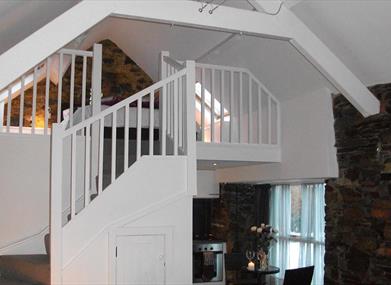 The Barn at Pink Cottage offers a unique and idyllic opportunity to experience total relaxation in a wonderful woodland setting. Recently converted in to luxurious accommodation, it exudes a certain charm, warmth and character.The open plan living area with galley kitchen is complemented with a lovely big wood burning stove, exposed stone walls and feature stained glass windows. All of which is overlooked by a romantic loft bedroom nestled under the eaves.