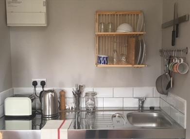 The Garden Studio has recently been renovated, there is a newly fitted ensuite bathroom with a large walk-in shower. The bedroom has a comfortable king size bed and we provide towels for all guests.The Garden Studio has a small kitchen that you can use for preparing simple meals - there is a fridge, sink, toaster, kettle and combination microwave & oven and we can provide a plug-in induction hob on request. The kitchen is kitted out with crockery, glassware and some cooking utensils. If you need to borrow anything else you can just let us know. There is a small dining area in the window in front of the garden for eating and relaxing. We'll provide you with the ingredients for preparing simple breakfasts while you are staying with us - freshly baked bread, butter, homemade jam, tea, coffee & milk.