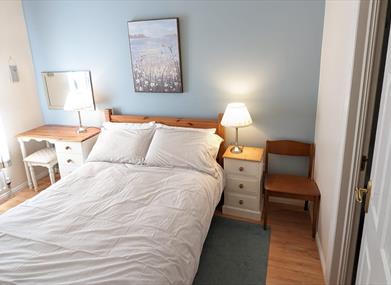 We aim to present a clean, comfortable and tastefully decorated house as a home from home with a double bedroom and ensuite shower room downstairs and a single room and bunk room upstairs next to the family bathroom. The sitting room (with open fire in winter) is upstairs to enjoy the view.