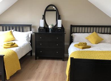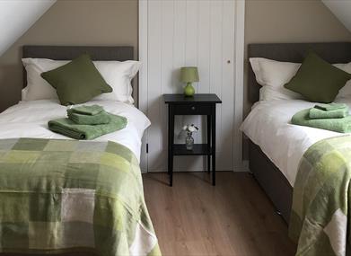 The Loft self catering apartment is hidden away from the main road, in the midst of green fields on a working farm. It is only a 10 minute walk into the historic village of Ardglass with its marina, castles, world class golf links, bars, cafes, restaurants and beaches. We are a 2 hour drive from Dublin and 1 hour from Belfast.The first floor apartment has 2 bedrooms, the larger one holding 2 double beds and the smaller one with 2 twin beds. There is a full bathroom with walk-in shower and a kitchen\living area that is fully equipped. Heating is supplied by oil fired radiators which have thermostatic valves so you can adjust the heat to suit yourself. All windows in the roof have blackout blinds to keep the early morning sun from disturbing your sleep.