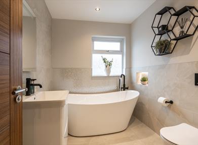 The 2.5 designer bathrooms feature state-of-the-art rain showers, luxury Molton Brown toiletries, and a lavish free-standing bath for ultimate relaxation. The gourmet in your group will revel in our professional-grade kitchen, equipped with a 5-ring induction hob, double oven, microwave, and an oversized French door fridge freezer. Additional luxuries include a Quooker tap, Nespresso Vertuo coffee, Villeroy & Boch crystal glassware, and quartz & marble worktops. For your convenience, we also have a washing machine and tumble dryer with an iron & ironing board with ample indoor & outdoor drying spaces, perfect for drying out your gear after a day hiking or golfing.
