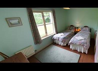 Opposite the fireplace there are the two downstairs twin bedrooms both with wash hand basins.