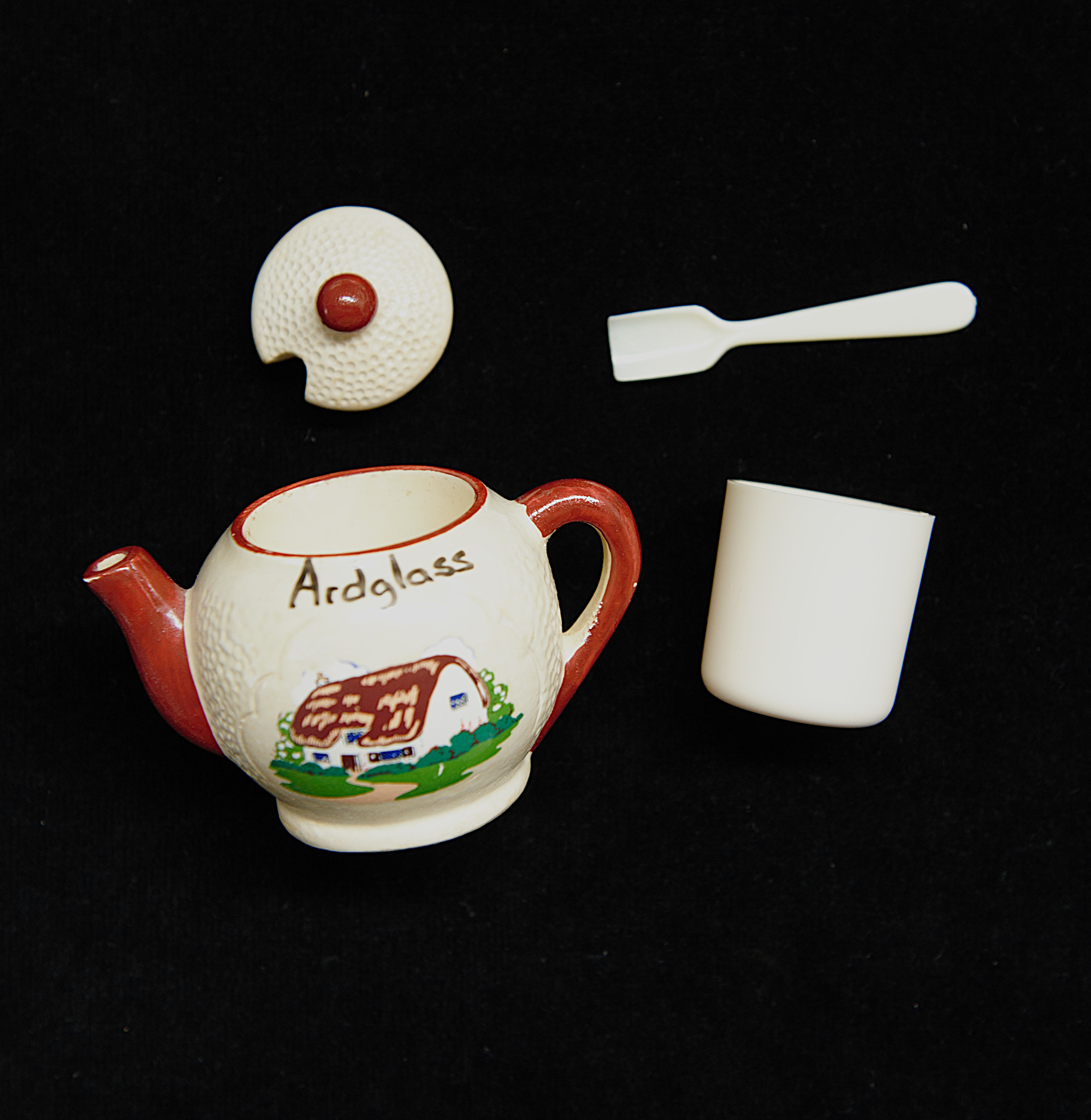 By the 19th century, County Down had emerged as a popular tourist destination with the advent of the new and expanding railways. Seaside towns in particular were flourishing, with Victorian and Edwardian visitors keen to take a piece of their holiday back home. Thus, the golden age of souvenir pottery was born. These ceramic pieces were often collected as memories or to be gifted to friends. The museum has a number of examples with images of holidaymakers or well-known topographical scenes transfer printed onto numerous vessels. One example from Ardglass in the shape of a teapot is in fact a mustard pot, with a traditional thatched cottage. Another example shows three figures in the snow with the words “A present from Newcastle” printed in gold.