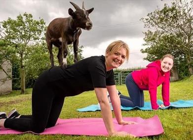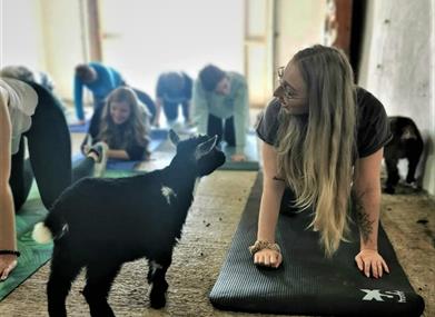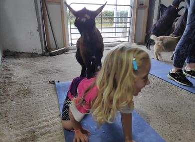 Our Pygmy and Nigerian goats are very friendly and just love taking part in yoga classes. They are very nimble and, if you're happy to experience it, will happily clamber up on your back in the midst of your yoga moves.