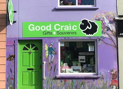 A visit to Good Craic Gifts is as much an experience as a shopping trip with local landmarks painted on the stairs and a life size painting of Giant Murphy, once the tallest man in the world who was from here, upstairs. The fairy mural on the front gives you a glimpse of the fun to be had inside.