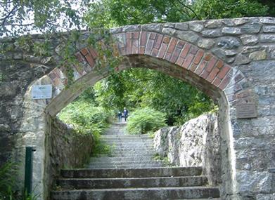 Steep ascents and descents, concrete paths & steps, off road paths on open hillside and through forest. The path is uneven in places with roots, rocks etc. May be slippery.