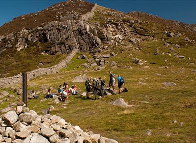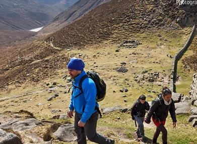 Walk left from the car park entrance to reach a combined gate and stile marking the start of the Trassey Track (75m). PLEASE USE THE STILE AND KEEP THE GATE CLOSED. Cross two further stiles to arrive at the forest edge and the beginning of open mountainside (1km). Beyond the third stile the track continues 1.5km to a ford. Threading its way uphill, the track approaches the Trassey River along the left hand side. At this point the cliffs of Spellack, the north-east shoulder of Slieve Meelmore flank the opposite bank of the river. Spellack is reputed to owe its present form to the erosive power of glaciers which swept across an older rock face to leave the granite cliffs freshly steepened. Today its sheer precipices provide challenging rock-climbs. A point just short of the ford provides a comprehensive view of Slieve Bearnagh: seen here between its neighbouring peaks of Slievenaglogh and Slieve Meelmore, from which the cols at Hare’s Gap and Pollaphuca separate it. Slieve Bearnagh is one of the most picturesque Mourne summits with its combination of height (739m), crags, summit tors and smooth rock slabs. The mechanised quarry workings on Bearnagh’s north face stem from a temporary post-war revival in the demand for foundation blocks and monumental stone. Cross the river and continue 100m to a ‘Y’ junction. Follow the level left fork (right fork climbs to the quarry) and cross a second ford. From here a winding track, commencing over the bare rock pavement and then through a boulder field, leads to the Mourne Wall at the Hare’s Gap (ca 600m). En route, note the tell-tale wedge marks around the edges of many granite stones. Such evidence of the stone-men’s ‘plug-and-feathers’ method of cutting stone can be seen on boulders large and small throughout the Mournes. The plug (a small iron wedge) was inserted between two thin pieces of steel (feathers) to split the stone along a line of roughly-prepared holes. From the Hare’s Gap a range of routes can be followed, exploring in a number of directions: Right - a stiff climb leads up Slieve Bearnagh, considered by some to be the grandest of all Mourne summits. Left - a continuation of the walk follows the Brandy Pad, passing beneath the Diamond Rocks (in 500m) on the side of Commedagh, great weathered granite pillars – likened to a ‘Giant’s Causeway’ high in the mountains. Whichever option is taken, the views from Bearnagh and along the Brandy Pad are spectacular. To complete your walk, retrace your steps back to the start. Please be aware - Although, there are numerous walking routes in the Mournes, the majority of these popular walks are not formally designated public rights of way. Most routes have developed over time due to traditional use. Below 600 feet (180m) most land is privately owned and is farmed or grazed. Many of the traditional access routes cross this land or pass along farm lanes and quarry tracks. Walkers are advised to respect that they may be walking on private land and are encouraged to make themselves aware of and adhere to the principles of 'Leave No Trace' - www.leavenotraceireland.org" Please remember that much of the land you will cross is private property and access is only available through the goodwill of the landowners. Although some areas of the countryside have been traditionally used for recreation, the public have no general rights to access such land and are only walking with the tolerance of the landowner.