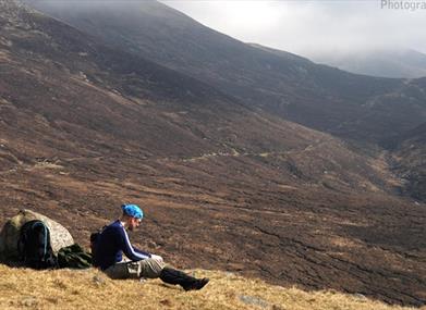 The Hare's Gap is the most dramatic mountain pass in the Mournes. Its sharply defined outline indicates that ice once passed this way; using the Gap's convenient north-south alignment to advance and retreat over the entire Mournes range. In more recent times the Hare's Gap marked the exit point for smuggled goods which had crossed the hills from the coast along the Brandy Pad. The contraband (which included soap, leather, spices and coffee) was carried through the mountains on the backs of small ponies which descended by the Hare's Gap to the valley of the Trassey River and on to Hilltown (a favourite distribution centre). Nowadays, the Gap's easily reached central location on the rim of the High Mournes makes it a popular starting point for routes scaling adjoining peaks, or simply for a walk along the gentle contours of the Brandy Pad.