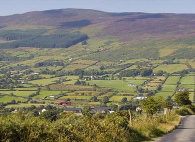 The walk eventually begins to lead on to steeper open mountain slopes with stunning views out to the Mourne mountains in the west as we track up Gullion’s Southern slopes to the Bronze age multi cist burial cairn. Camlough lake far below is a sight to behold.