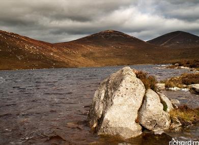 Lough Shannagh walk leads up hill on the 'Banns Road', an off road farm track. The route circles Lough Shannagh (in an anti-clockwise direction) with a high point of 587m at Carn Mountain. It also follows and crosses the Mourne Wall on places.