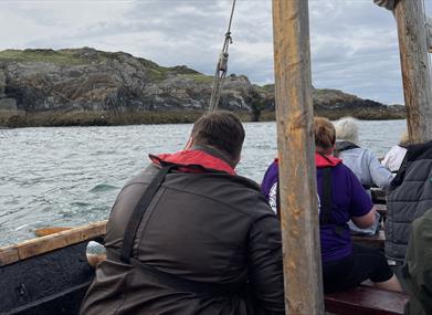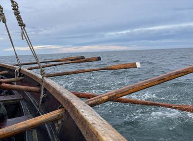 - 4 rowers, a cox, and storytelling guide on a boat used in the Vikings television series.
