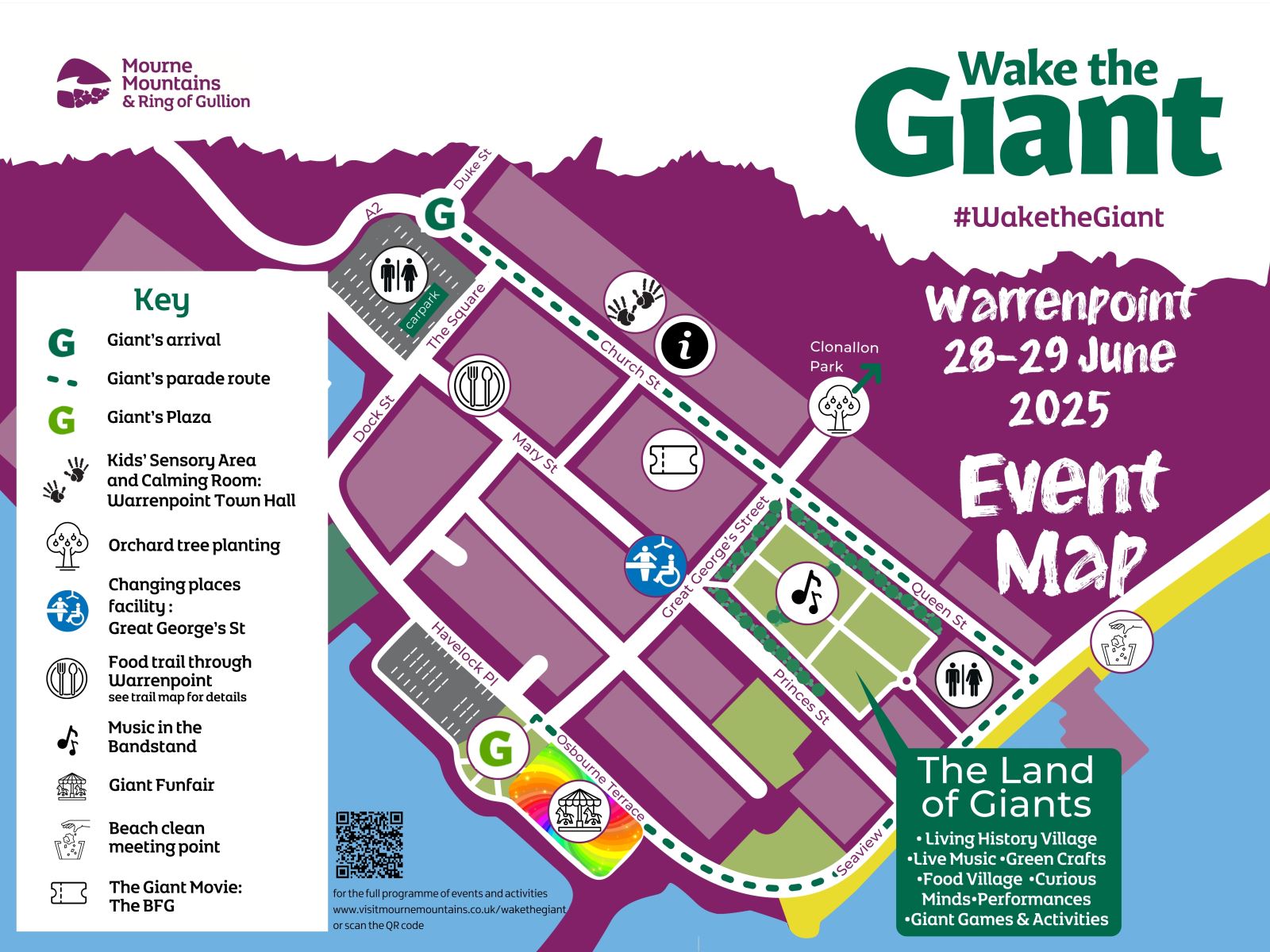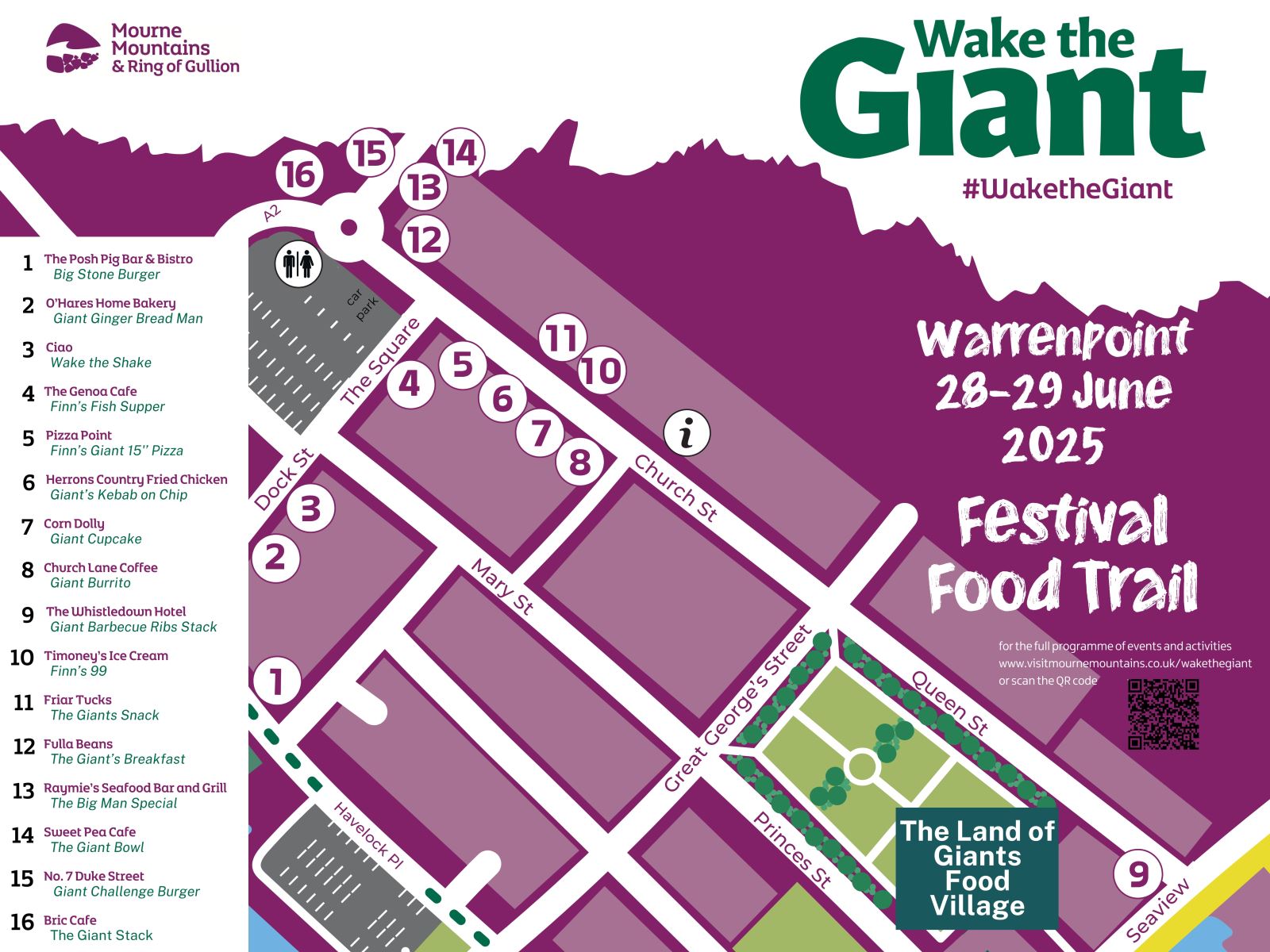 Plan your visit with our Wake the Giant Festival map – your go-to guide for all the action in Warrenpoint this summer. Whether you're coming to see the spectacular Giant Parade, explore family-friendly activities, or enjoy live music and local food, this easy-to-use festival map will help you make the most of your time.
