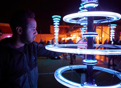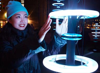 Visitors enjoying 'Illumaphonium: halo' interactive light and sound installation in Newry City this February.
