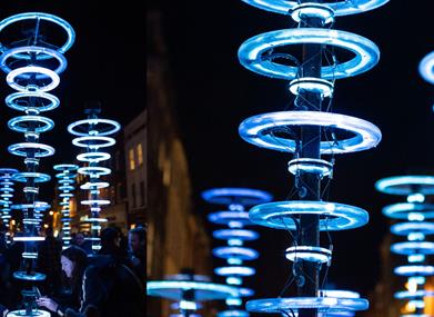 Created by Michael Davis, this dynamic and interactive multi-sensory light and sound installation will illuminate and make sound when the pieces are touched. The work will be lit from 5pm to 10pm each night in Sugar Island and outside Newry Town Hall.
