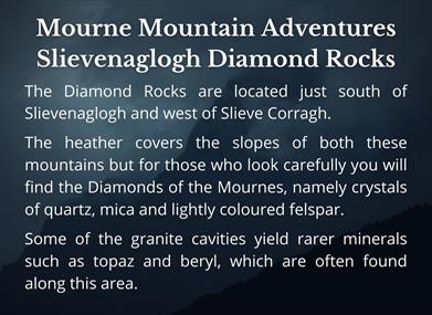 The Diamond Rocks are located just south of Slievenaglogh and west of Slieve Corragh in the Mourne Mountains.