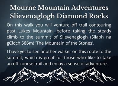 On this walk you will venture through tollymore then off trail past Lukes Mountain, before taking the steady climb to the summit of Slievenaglogh (Sliabh na gCloch 586m) 'The Mountain of the Stones'.
