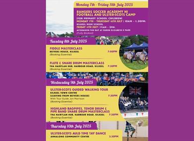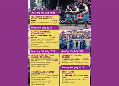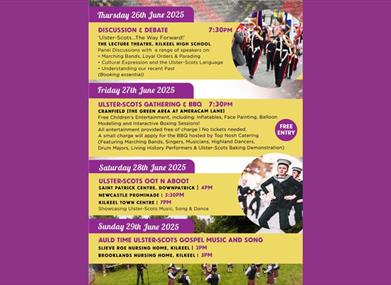 This will include Ulster-Scots heritage and history exhibitions, baking events, a Gathering and BBQ, lambeg drumming competition, singing and poetry events, music and dance workshops, socials, historical commemoration events, educational talks and presentations, food events, tea dances, concerts, competitions, afternoon family fun day events, cultural pageants, open air concert, bonfire and fireworks.