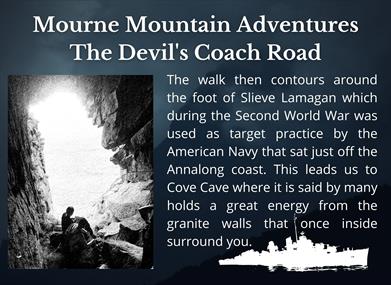 The adventure continues as we traverse the foot of Slieve Lamagan, once a target for the American Navy during World War II. Feel the energy emanating from Cove Cave, surrounded by its magnificent granite walls, as you delve deeper into its mysteries.